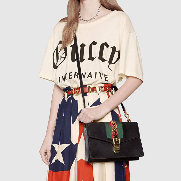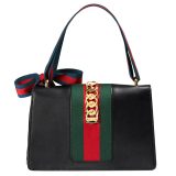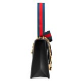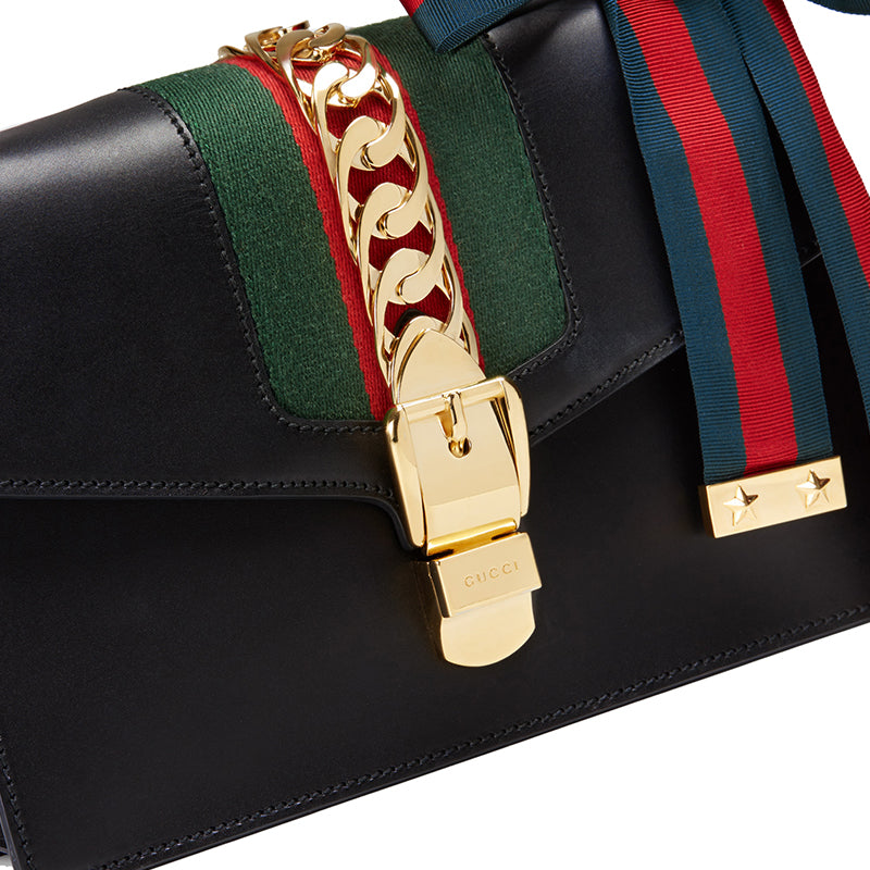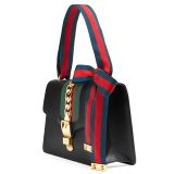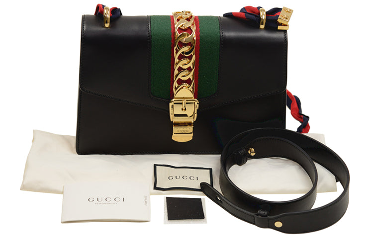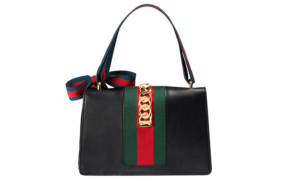 (WMNS) Gucci Sylvie Gold buckle Stripe Webbing Bow Wide Version Leather handbag Small Black 421882CVLEG-8638